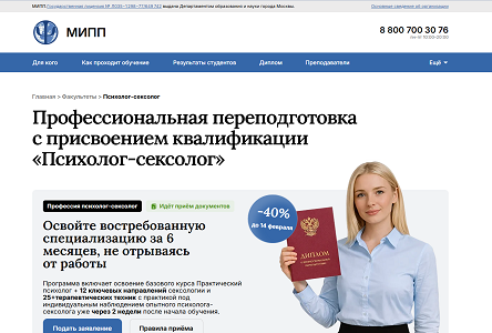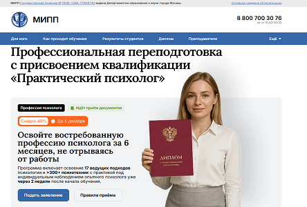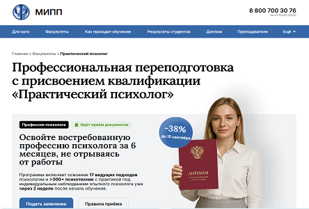 Международный Институт Профессиональной Психологии (МИПП) — это образовательная онлайн-платформа с государственной лицензией, которая помогает людям освоить востребованную профессию психолога. Предлагает полный 6-месячный курс "Практическая психология", который включает в себя 48 лекций, более 300 инструментов и техник, а также глубокое изучение 17 ведущих направлений психологии, таких как гештальт-терапия, психоанализ, КПТ, психосоматика, семейная и детская психология, коучинг и другие.