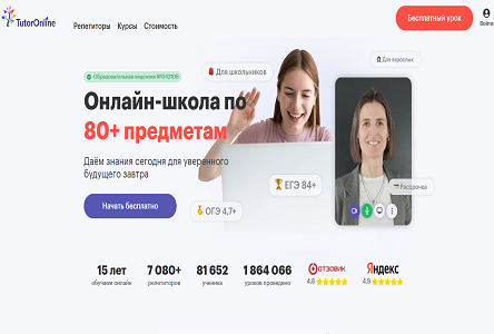 TutorOnline — онлайн школа по 80+ предметам разной направленности и уровня подготовки. Имеет лицензию на образовательную деятельность.