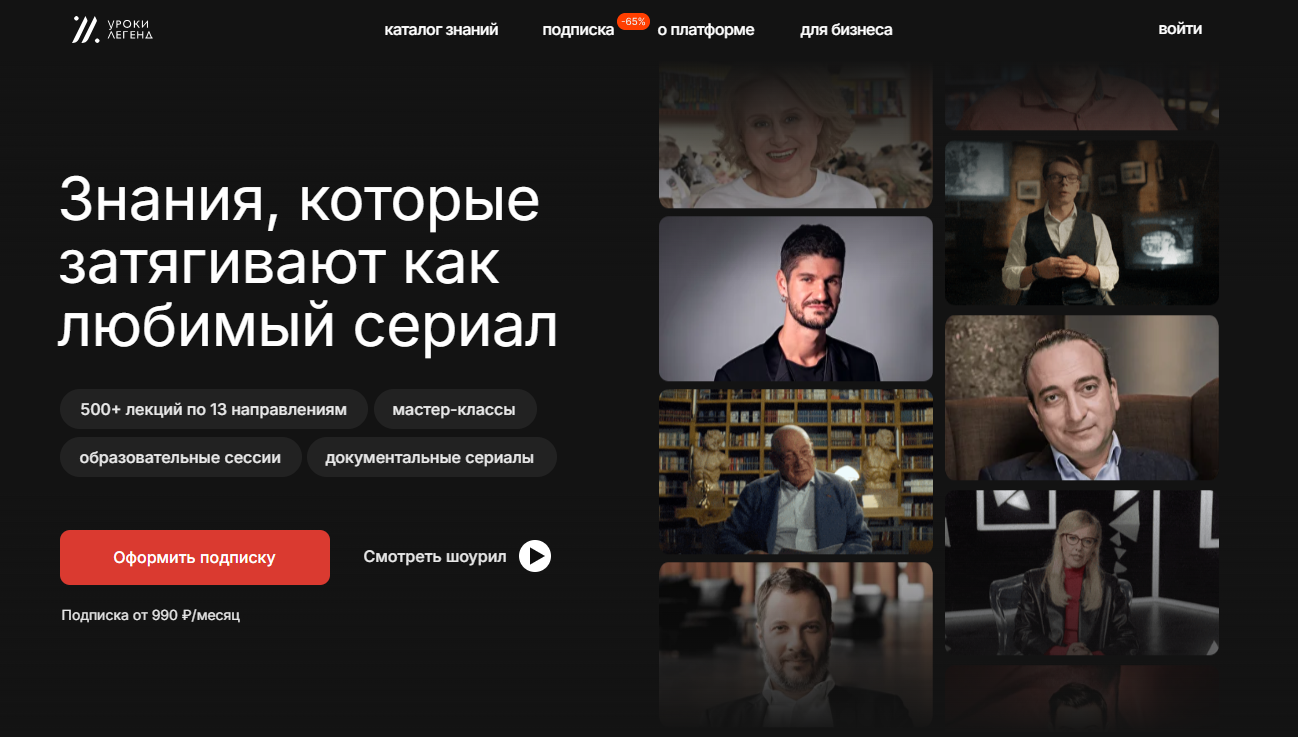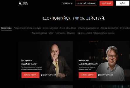 "Уроки Легенд" — онлайн-платформа с видеоуроками известных мастеров и признанных экспертов своего дела, таких как Владимир Познер, Константин Райкин, Валерий Тодоровский, Сергей Лукьяненко, Константин Меладзе, Дима Билан и других. Курсы от звезд индустрий по медиа, актёрскому мастерству и режиссуре, фотографии, музыке, моде и дизайну, бизнесу.